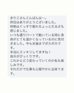 施術後、こんなご感想をいただきました。 昨晩はぐっすり眠れて、少しだるさも感じました。 いつも通りパートで動いている時に、身体がとても温かくなっているのに気づきました。今も末端までポカポカです。 本当に...